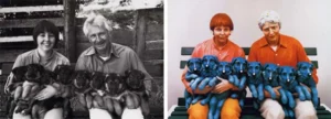 Left: Art Rogers, Puppies, 1985 © Art Rogers. Right: Jeff Koons, String of Puppies, 1988