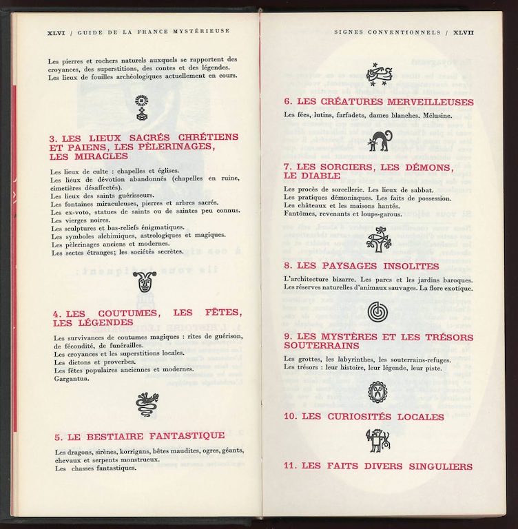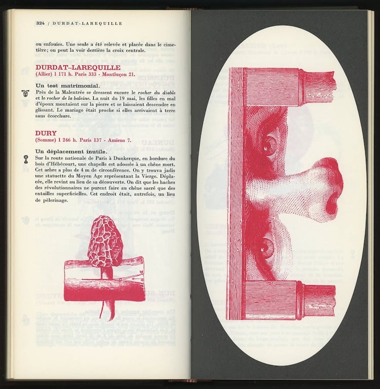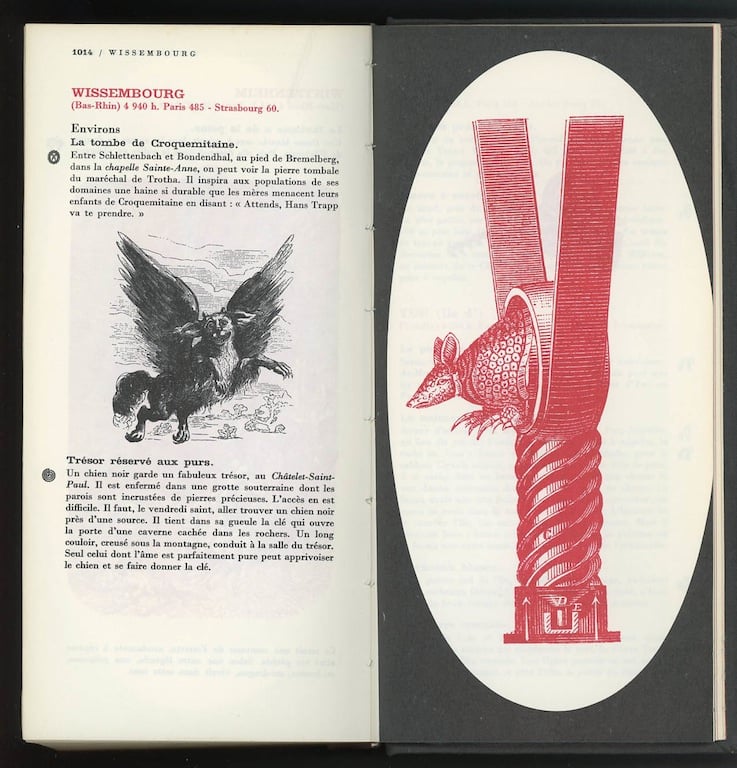 In the years after the Second World War, Surrealism was still an active cultural presence in France. An International Surrealist exhibition dedicated to the theme of Eros took place in Paris in 1959, and a succession of new Surrealist journals made their appearance. Breton continued in his position as leader of the Surrealist movement, which was only disbanded following his death in 1966. The guide’s publisher, Claude Tchou, also produced books by Breton, Ernst and the Surrealist poet Paul Eluard; in 1968, he published an edition of the notorious Story of O by Pauline Réage, with illustrations by the Surrealist painter Léonor Fini. The markedly surreal dimension of Tchou’s strangely ancient-looking handbook-cum-passport to enigmatic monuments, miraculous occurrences and marvelous beings reflects the incredible persistence of an internationally influential movement that had begun in Paris four decades earlier.