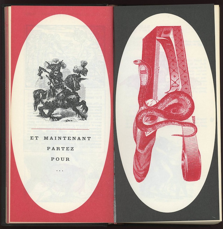 Every spread in the alphabetical guide has at least one illustration. There are looming spires and towers, ruined castles, grinning devils, giants, witches, flying chariots, nocturnal apparitions, writhing serpents, vampire bats, succubi, levitating skeletons, dancing crabs, a three-headed demon riding a snake, and the mysterious menhirs of Carnac. As well as the letterforms, Cieslewicz supplies smaller decorative collages composed of just two or three incongruous elements: a fossil with the head of a tapir; a pair of eyes trapped inside a cogwheel; a giant snail in promiscuous congress with a mandolin. These, like his bizarre alphabet and some of the historical engravings, are printed in red, and the graphic equivalence of the two kinds of visual material, the archival and the manipulated, draws out the implicit connections between Gothic imagery and mid-20th-century Surrealism.