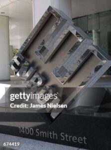 Paul Rand, logo for Enron Corportion in front of the company’s corporate headquarters in Houston, Texas. Photo by James Nielsen/Getty Images.