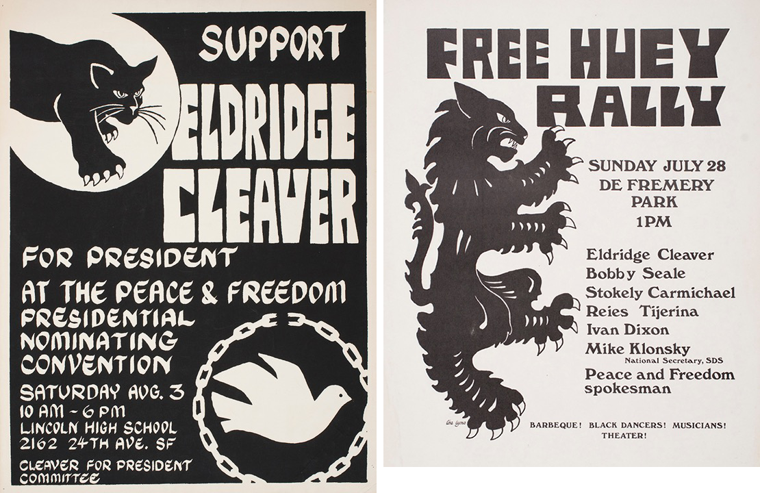 LEFT: Poster for rally for Eldridge Cleaver for President, San Francisco, August 3, 1968; Docs Populi digital archive. RIGHT: Free Huey Newton rally, Oakland, July 28. Poster courtesy Lisbet Tellefsen collection, image by author.