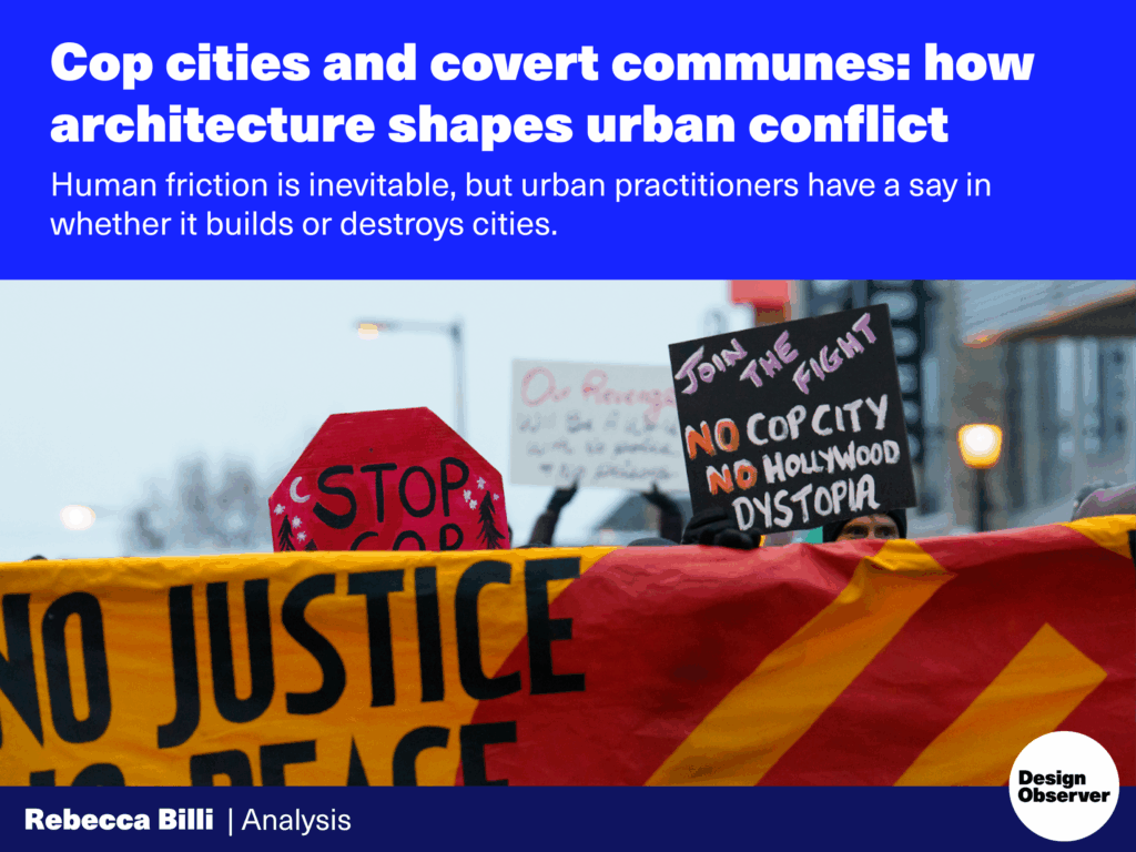 Rebecca Billi’s smart, timely essay “Cop cities and covert communes” has been living rent-free in my head for the past week. I use “rent-free” in the internet speak type of way, but also to mean something more literal. Billi reaffirms design’s capacity to create urban landscapes that are more than means to collect capital.